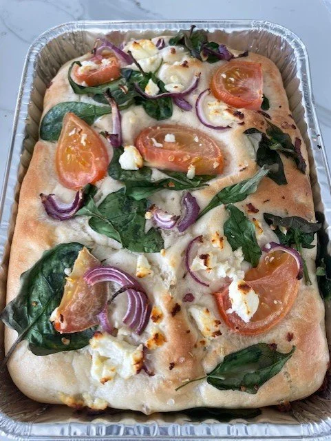 This beautiful Italian bread is very versatile It has delicious toppings of red onion, spinach, tomato,feta, rosemary and salt.
