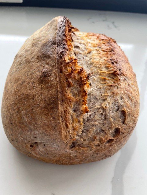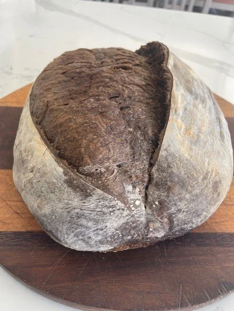 A beautiful Sourdough full of flavor. It is made with wheat and purply grain flours.