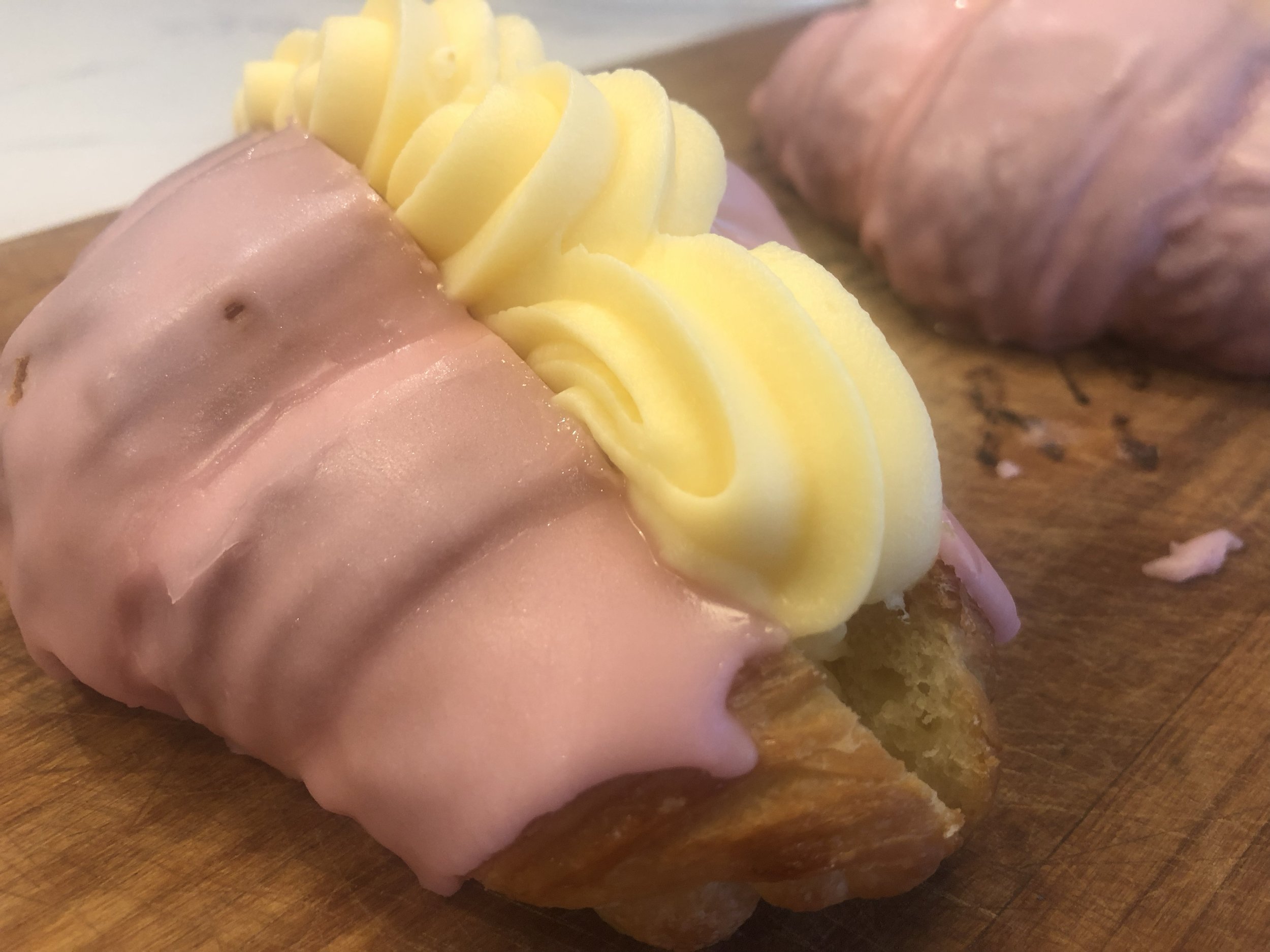 This is a combination of a croissant and a custard square, A buttery Croissant filled with custard and topped with a delicious icing glaze.