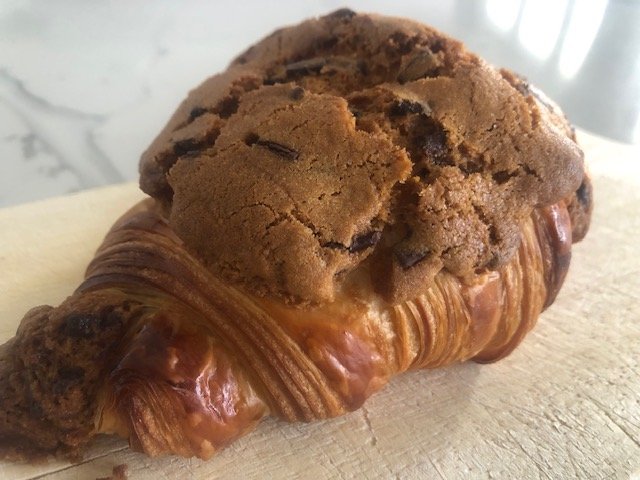 The Cookie croissant is a delightful fusion of a croissant and a cookie. This pastry combines the buttery, flaky layers of a classic croissant with the chewiness of a choc chip cookie. Enjoy!